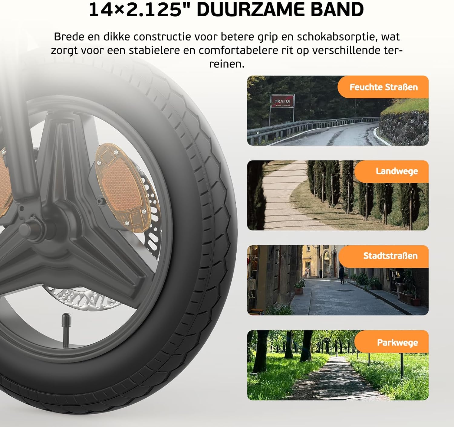 • 14” extra breite Reifen – guter Grip & effizienter Rollwiderstand in der Stadt