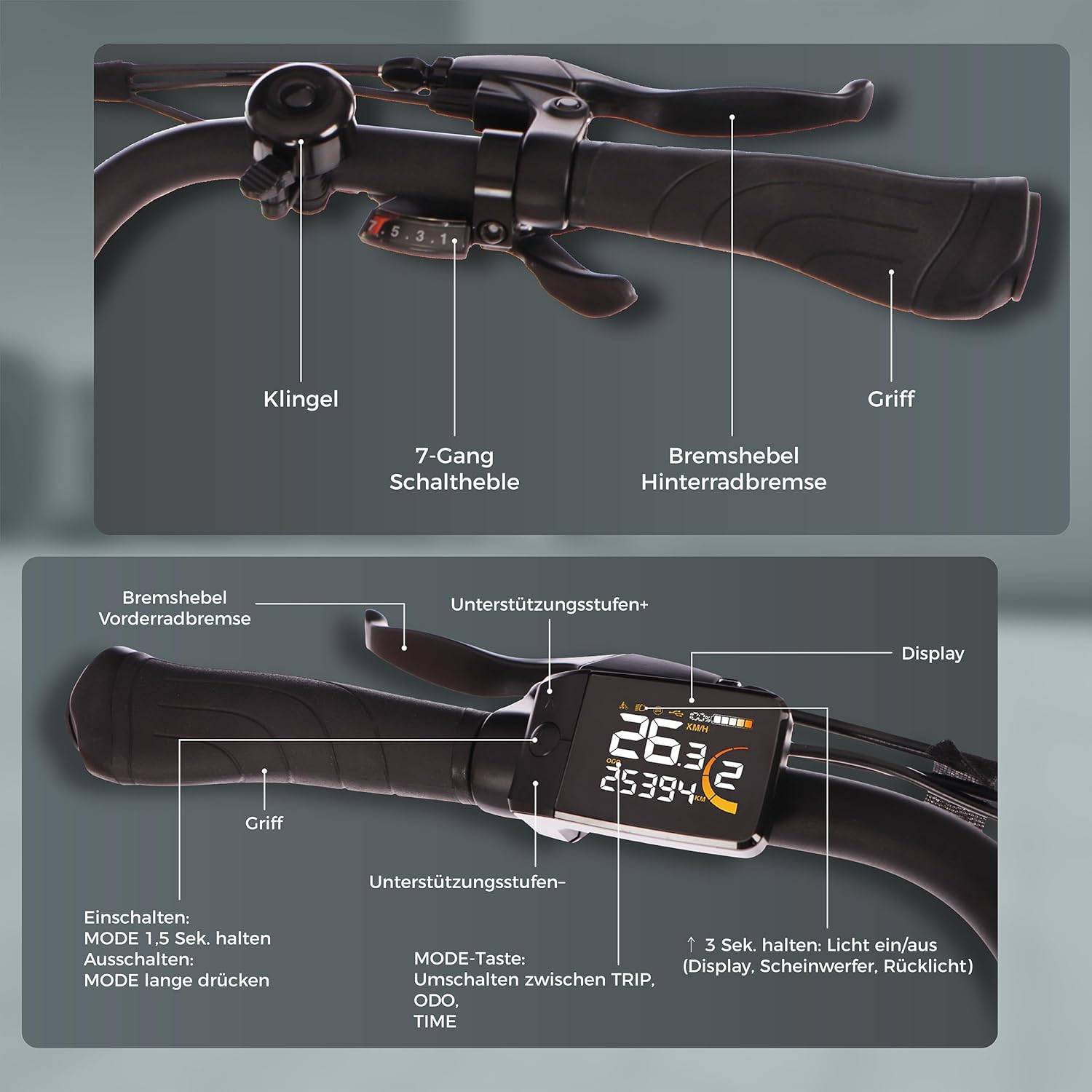 LED-Display: Speed, TRIP/ODO, Motorleistung, Schiebehilfe, Unterstützungsstufe, Licht, Akku-Status