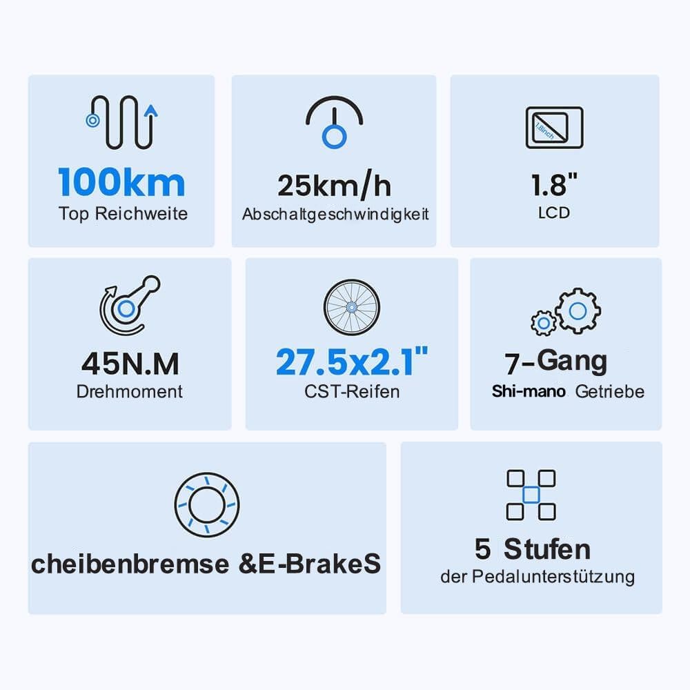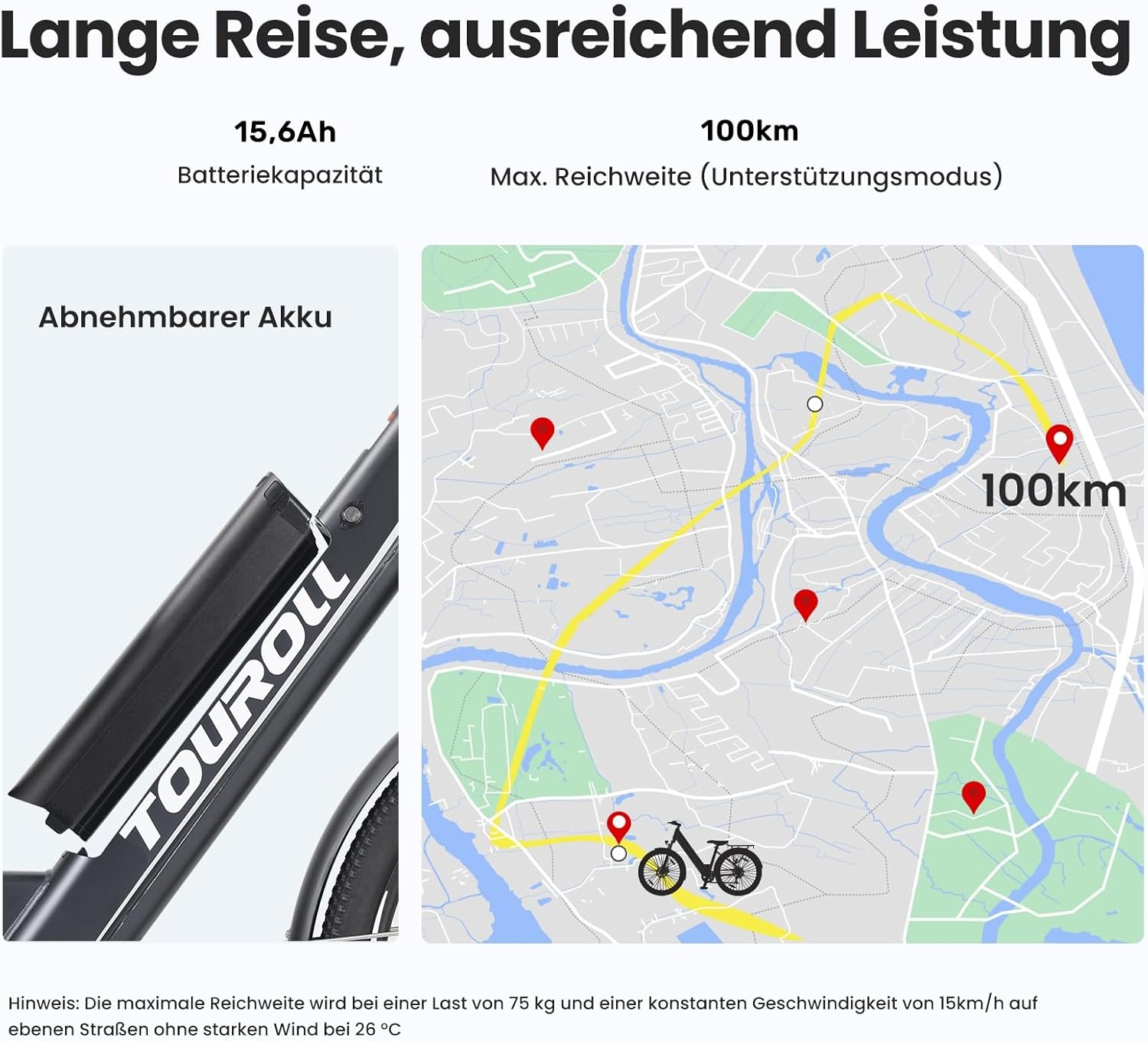 • Reichweite bis ca. 100 km im Unterstützungsmodus (laut Text)